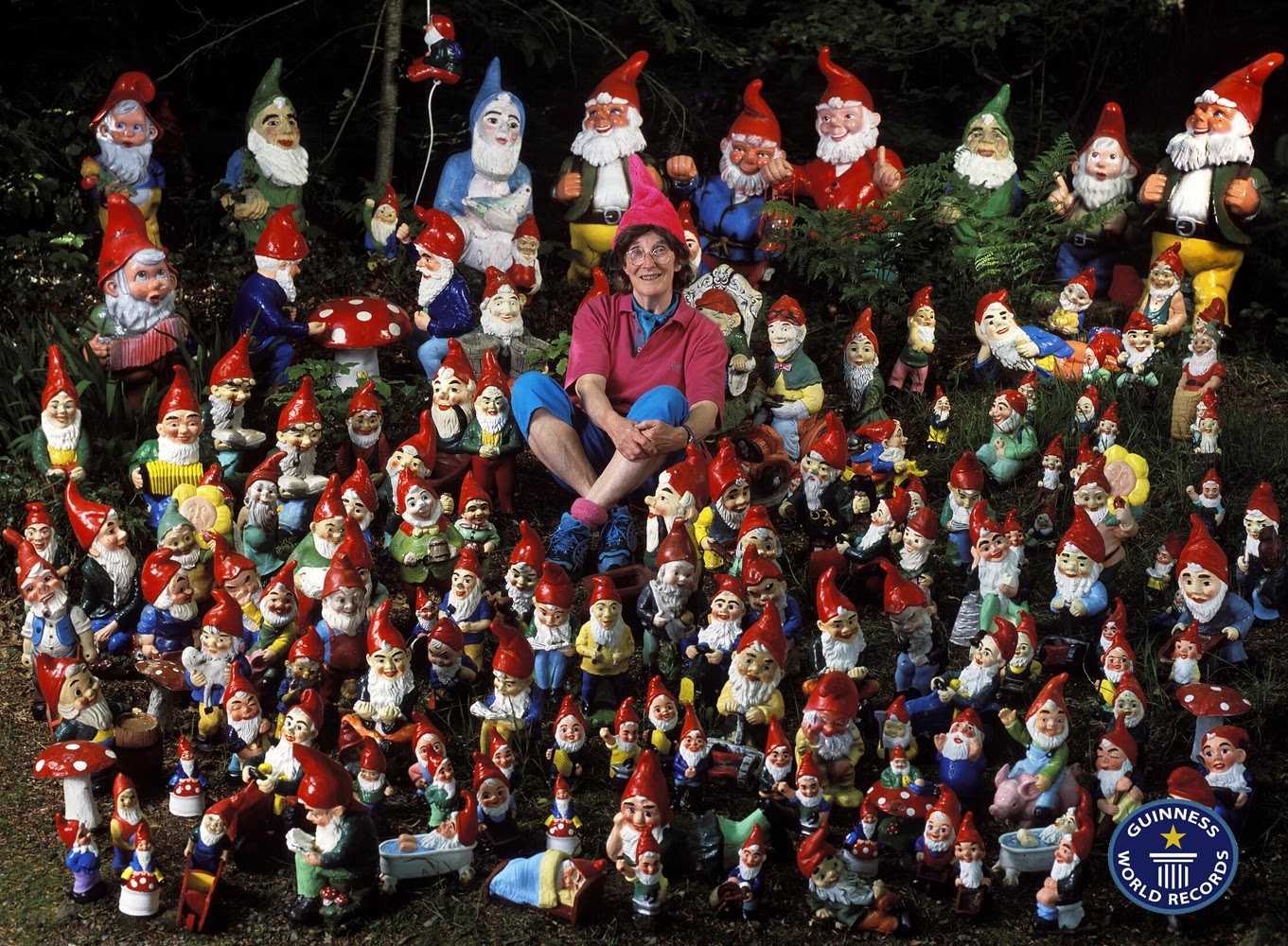Há quem se encante por duendes de jardim! Por exemplo, Ann Atkin, que é fanática por estes simpáticos bonecos! Tem já mais de 2000 exemplares de todos os tamanhos, o que lhe valeu uma medalha dos recordes do Guinness. Alguns são do tamanho de pessoas! Uau!