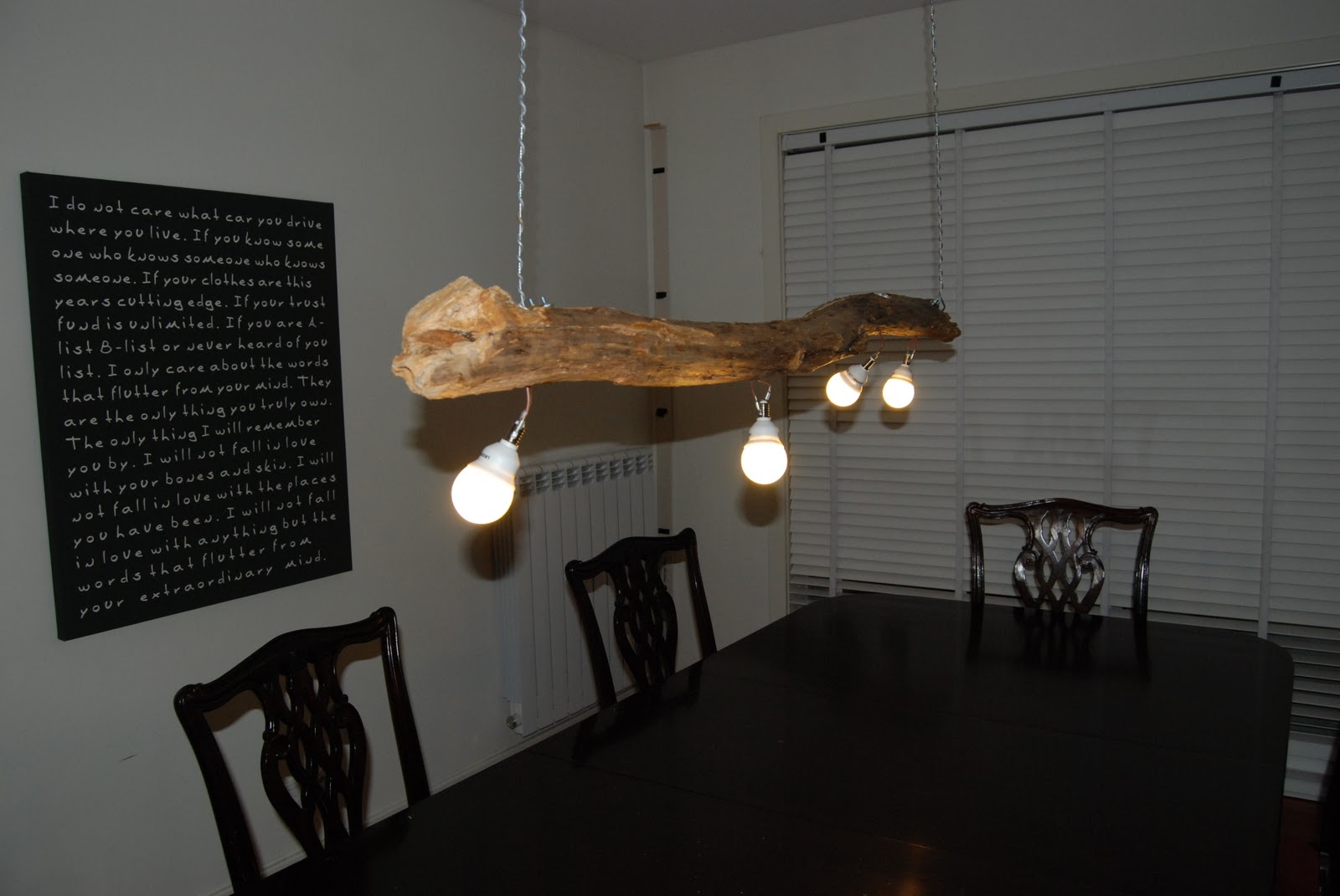 Também a zona de refeições pode ser maravilhosamente iluminada. Já viu como dá um ar super rústico e ao mesmo tempo mega luxuoso este tronco de árvore por cima da mesa? É um candeeiro ao comprido que poderá fazer sem gastar muito dinheiro. Peça ajuda aos seus amigos mais engenhosos!