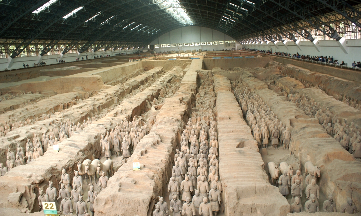 Foi durante as escavações de um poço de água que, em 1974, um grupo de 7 agricultores locais encontrou uma estátua. O que eles não sabiam era que afinal existiam milhares delas debaixo do solo. São cerca de 8000 soldados em terracota todos diferentes, já que representam o exército do poderoso imperador Qin Shi Huang, como se veio a verificar. Têm pormenores complexos e variam de tamanho e peso. Encontraram-se também carros e cavalos em tamanho real. Estima-se que tenham sido construídos no séc III antes de Cristo e são um dos maiores tesouros arqueológicos da China.