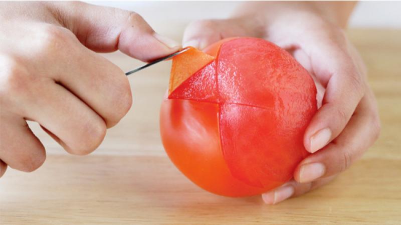 Faça um “X” com a faca nas duas extremidades do tomate. Coloque o tomate numa panela com água a ferver durante 1 ou 2 minutos. Quando perceber que a pele está a soltar-se retire da água o tomate e, com a ajuda da faca, retire a pele. Vai ver que vai sair facilmente!