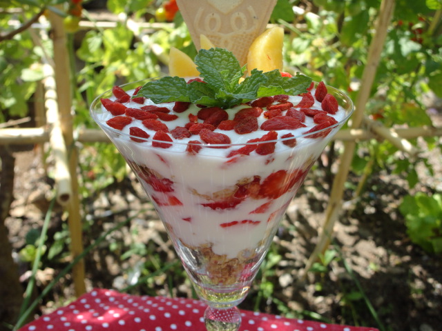 Coloque numa taça uma camada de muesli, depois uma camada de iogurte. De seguida, junte os morangos aos bocadinhos, coloque novamente muesli e termina com mais iogurte. Por último, coloque as bagas goji e decore a gosto!