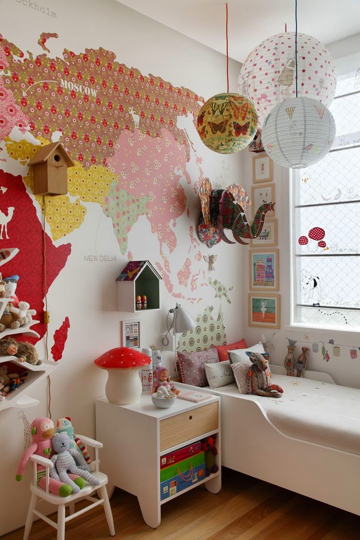 É importante incluir na decoração do quarto um elemento que fomente a curiosidade da criança pelo mundo, como planisférios, mapas ou globos. Veja, por exemplo, este papel de parede ou o abajur da foto, tão original!